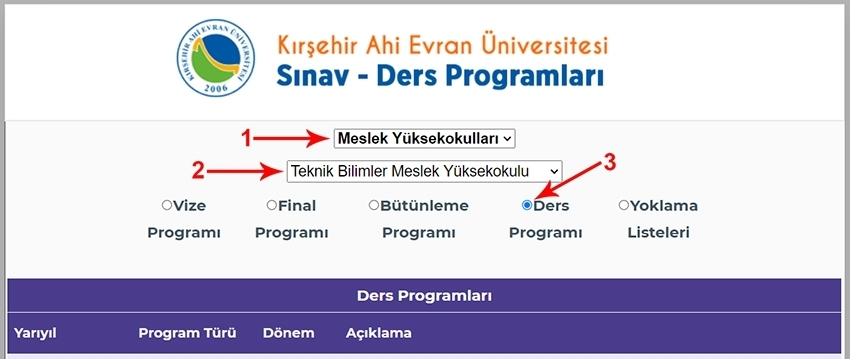 Yüksekokulumuz 2025-2026 Eğitim-Öğretim Yılı Güz Yarıyılı haftalık ders programı Kırşehir Ahi Evran Üniversitesi Sınav-Ders Programları modülünde (https://ahisinav.ahievran.edu.tr/) ilan edilmiştir.